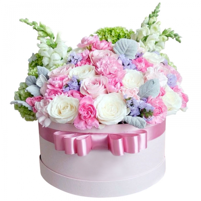 Шляпная коробка с цветами «Зефир» – идеальный подарок, который не оставит равнодушной ни одну девушку. Розы 7 шт., Гвоздики 5 шт.