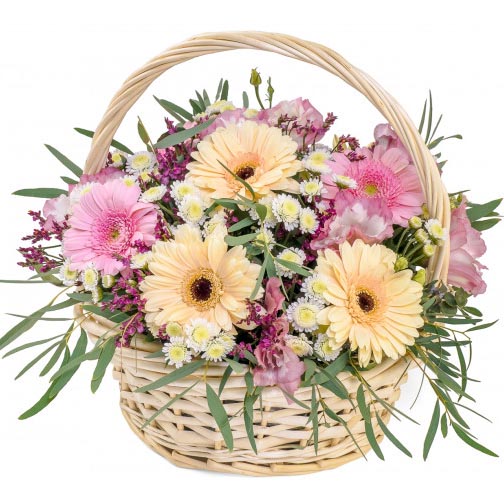 Гербера мини 7 шт, Гиперикум 3 шт, Корзина мал.1 шт, Лимониум 2 шт, Оазис 1 шт, Хризантема сантини 2 шт, Эвкалипт, Эустома 1 шт