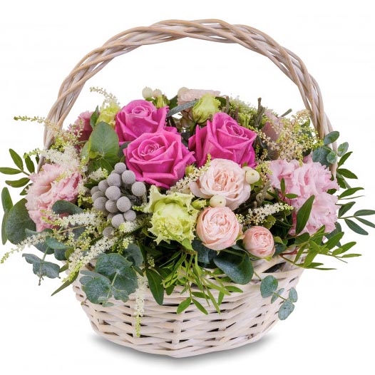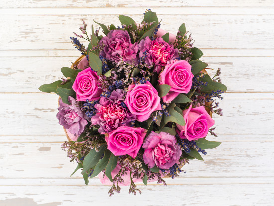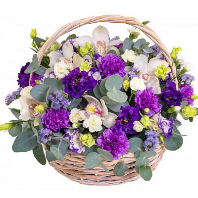 Корзина средн. 1 шт, Оазис 3 шт, Статица 3 шт, Орхидея 5 шт, Эвкалипт, Эустома 6 шт, Гвоздика 10 шт, Гвоздика кустовая 5 шт