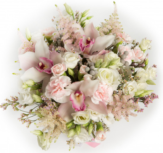 Зефирное сочетание розовых роз и утонченных альстромерий. Роза 19 шт, Гвоздика 10 шт., Фрезия 10 шт., Орхидея 9 шт., Альстромерия 10 шт.