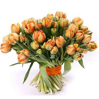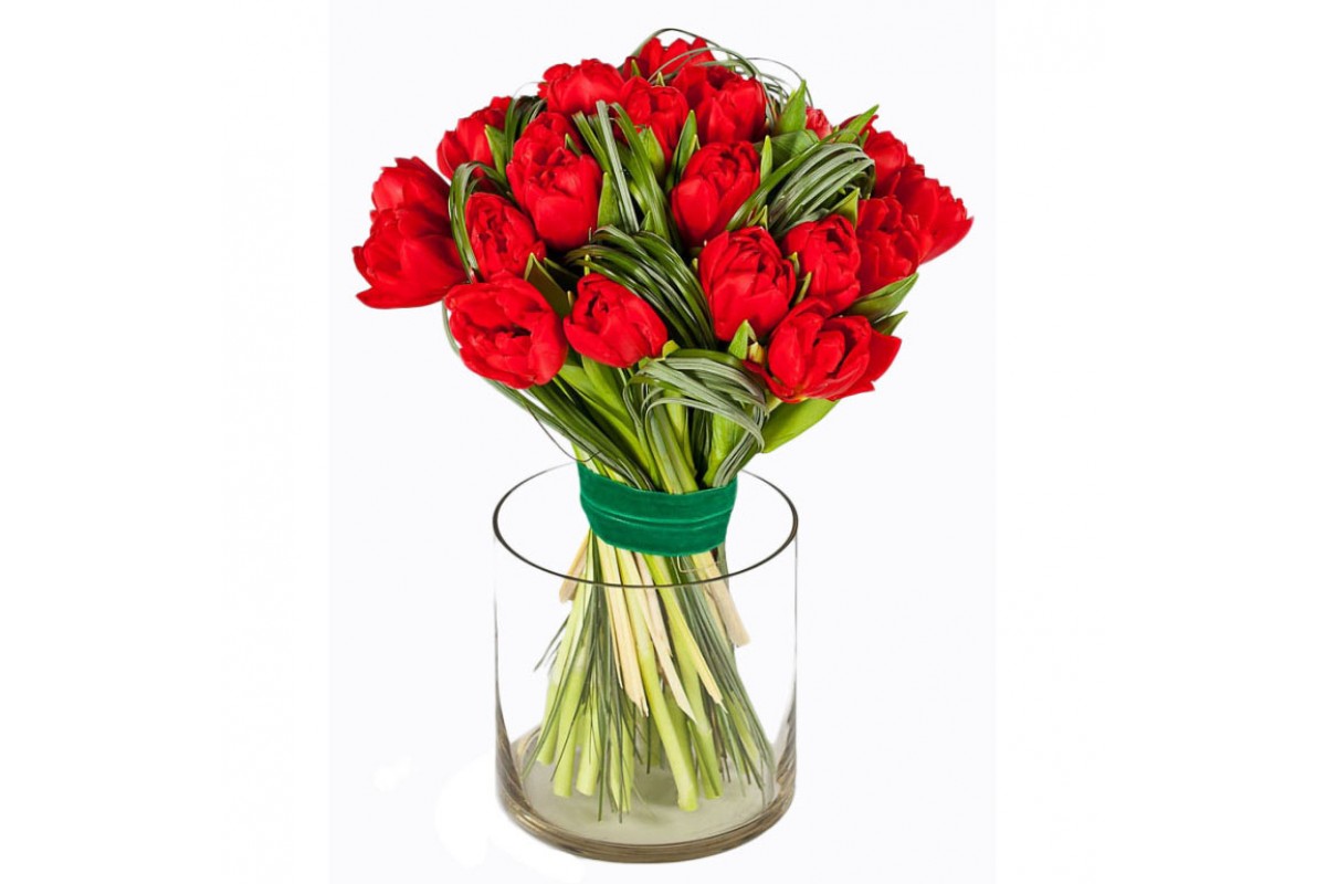 Ароматный, нежный и насыщенный букет! Ранункуллус Клуни - 7шт., Тюльпан Ред Принцесс - 20 шт., Фрезия - 10 шт., Берграсс - 1 шт., Салал - 1 шт.