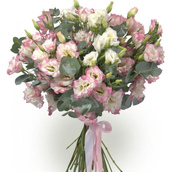 В его составе пушистые эустомы в бело-розовой гамме. Они смотрятся объемно, создавая впечатление охапки цветов. Эустома 15 шт, Эвкалипт 1 пуч
