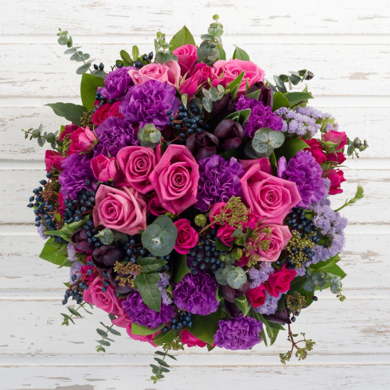 Скимия 1 шт., Эустома 5 шт., Эвкалипт, Фрезия 5 шт., Статица 2 шт., Гвоздика 5 шт., Роза пионовидная 12 шт., Роза кустовая пионовидная 5 шт.