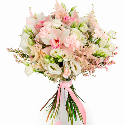 Нежный светло-персиковый букет. Орхидея 3 шт., Эустома 5 шт., Лимониум 5 шт., Астильба 5 шт., Бруния 4 шт., Гвоздика кустовая 3 шт., Эвкалипт