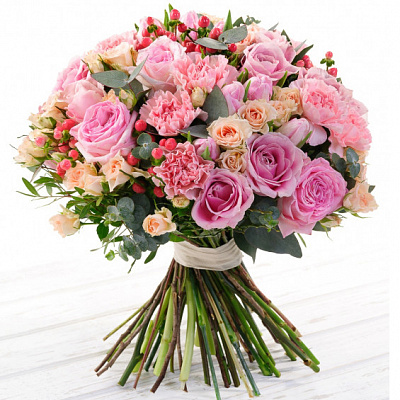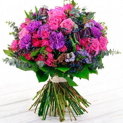 Роза (60 см) 10 шт., Роза кустовая 10 шт., Роза пионовидная 5 шт., Гиперикум 5 шт., Гвоздика 10 шт., Тюльпан 10 шт., Эвкалипт 1 пуч., Писташ 1 пуч.