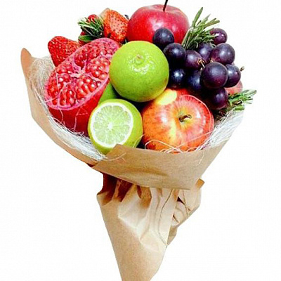 Красочный букет собран из клубники в флористической упаковке крафт будет хорошим и ярким украшением любого праздника, и добавит позитива.