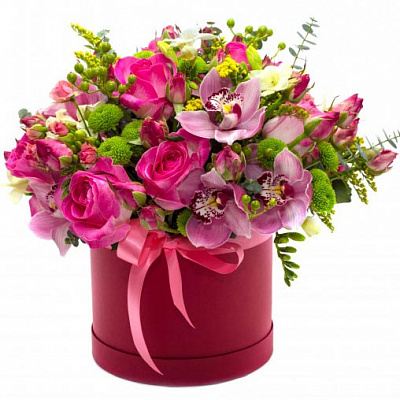 Розы - 5 шт., Диантус-1 шт., Альстрамерия- 3 шт., Пионы-1 шт., Дендробиум-2 шт., Орхидея-2 шт., Бруния-2 шт., Эустома-2 шт., Зелень.