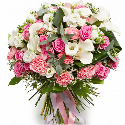 Гвоздика 13 шт., Эустома 5 шт., Калла 15 шт., Эвкалипт, Аспидистра 6 шт., Фрезия 10 шт., Роза (60 см) 21 шт., Лимониум 5 шт., Салал 1 пучок