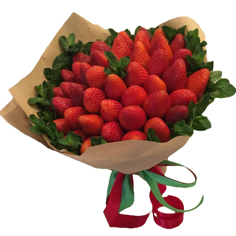 Красочный букет собран из клубники в флористической упаковке крафт будет хорошим и ярким украшением любого праздника, и добавит позитива.