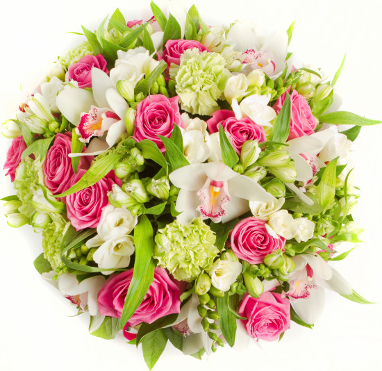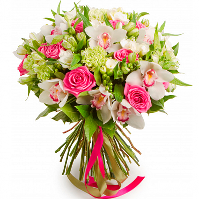 Зефирное сочетание розовых роз и утонченных альстромерий. Роза 19 шт, Гвоздика 10 шт., Фрезия 10 шт., Орхидея 9 шт., Альстромерия 10 шт.