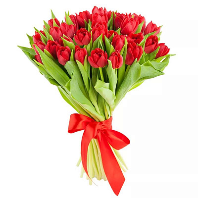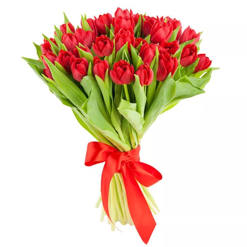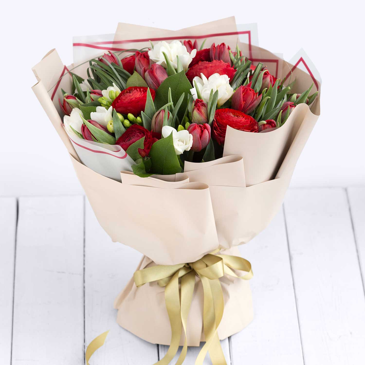 Ароматный, нежный и насыщенный букет! Ранункуллус Клуни - 7шт., Тюльпан Ред Принцесс - 20 шт., Фрезия - 10 шт., Берграсс - 1 шт., Салал - 1 шт.