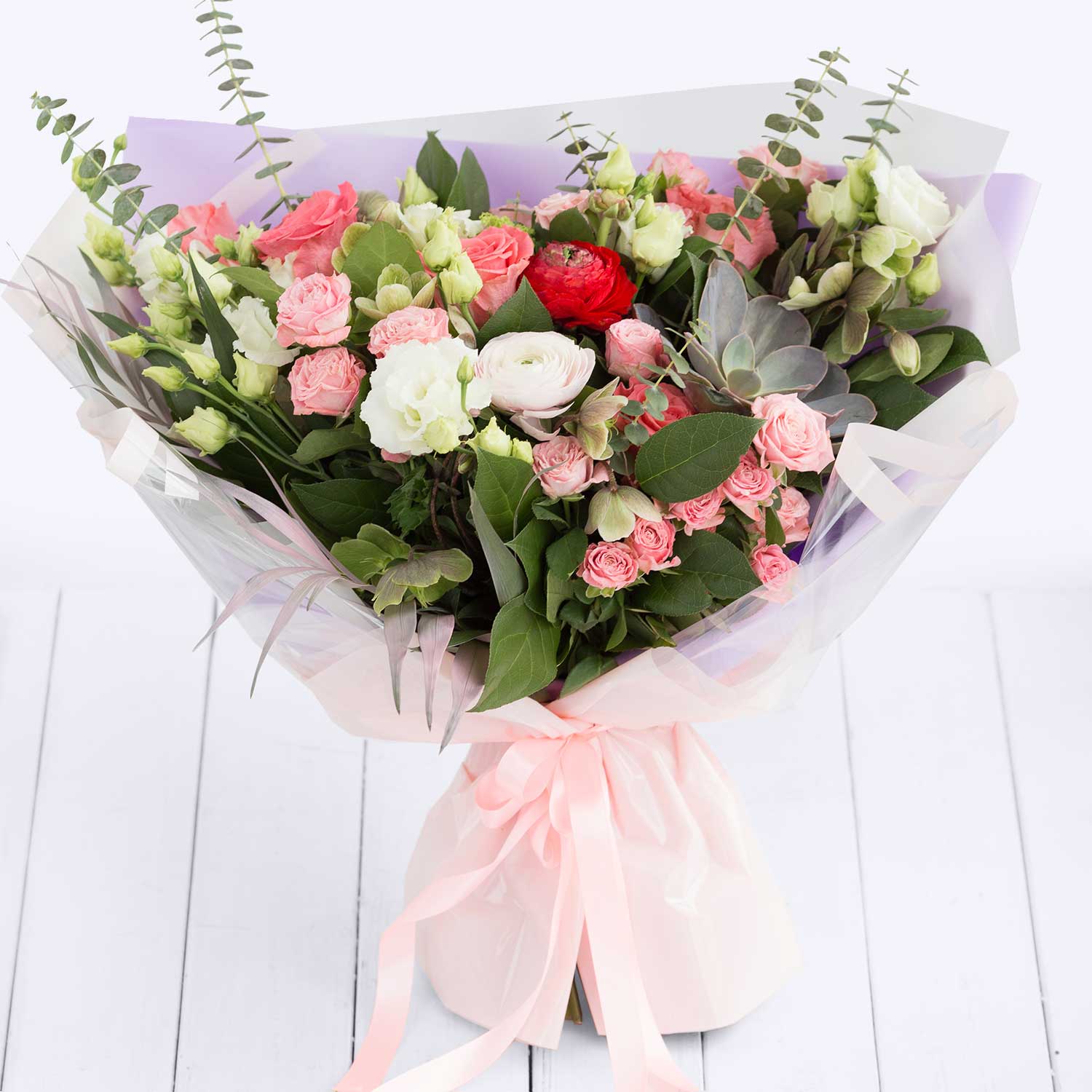Милая и воздушная композиция в пакете плайм из эустом и шикарных ранункулюсов. Эустома 7 шт., Ранункулюс 5 шт., Кустовая роза 3 шт., Гвоздика 1 шт.