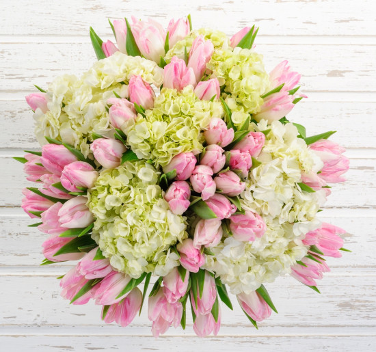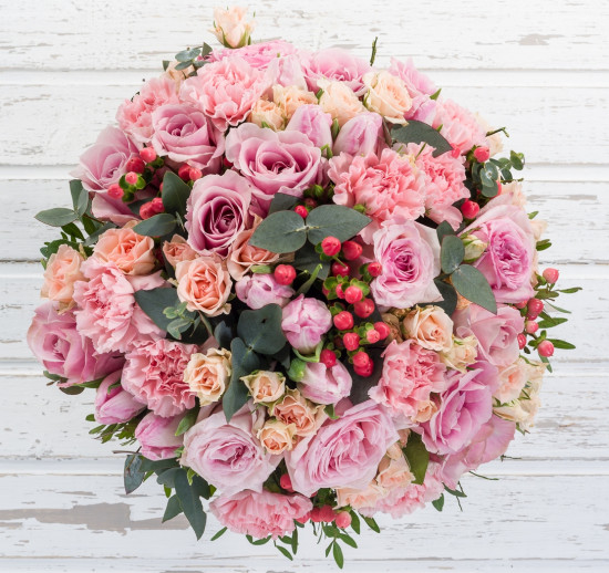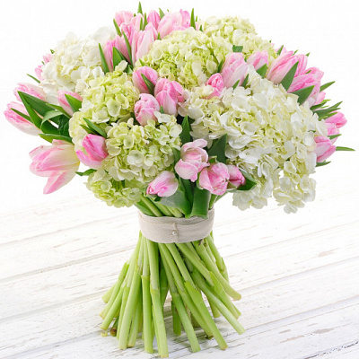 Роза (60 см) 10 шт., Роза кустовая 10 шт., Роза пионовидная 5 шт., Гиперикум 5 шт., Гвоздика 10 шт., Тюльпан 10 шт., Эвкалипт 1 пуч., Писташ 1 пуч.
