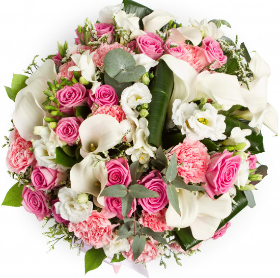 Гвоздика 13 шт., Эустома 5 шт., Калла 15 шт., Эвкалипт, Аспидистра 6 шт., Фрезия 10 шт., Роза (60 см) 21 шт., Лимониум 5 шт., Салал 1 пучок