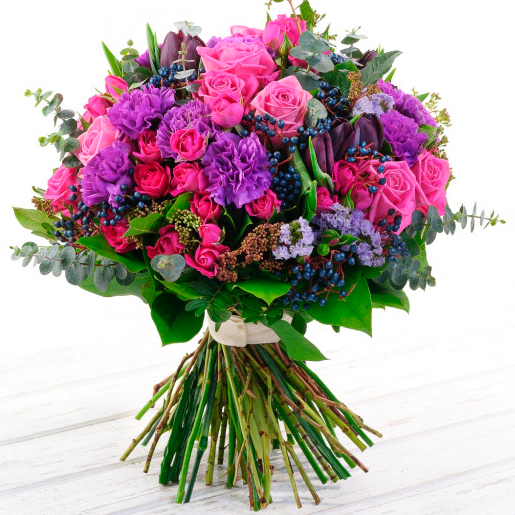 Скимия 1 шт., Эустома 5 шт., Эвкалипт, Фрезия 5 шт., Статица 2 шт., Гвоздика 5 шт., Роза пионовидная 12 шт., Роза кустовая пионовидная 5 шт.