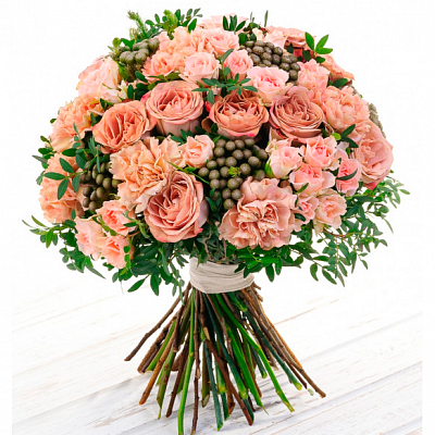 Нежный букет из французских роз и диантусов! Персиковые розы - 5 шт., Диантус - 5 шт., Кустовые розы - 3 шт., Салал для украшения.